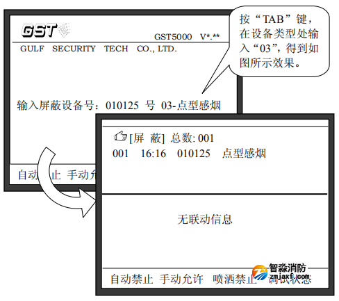 注意:在進行消防主機“屏蔽”操作中輸入設備的編碼時,可以使用通配符“*”,“*”代表這一位可以是0~9中的任意一個數(shù)字,這個功能可以方便的將一類設備取消屏蔽。例如:如果要屏蔽掉系統(tǒng)中所有的點型感煙火災探測器,我們可以在屏蔽操作時輸入:“******”,“TAB”,“03”,這樣所有點型感煙火災探測器將被屏蔽。其中“03”為點型感煙火災探測器設備類型代碼。